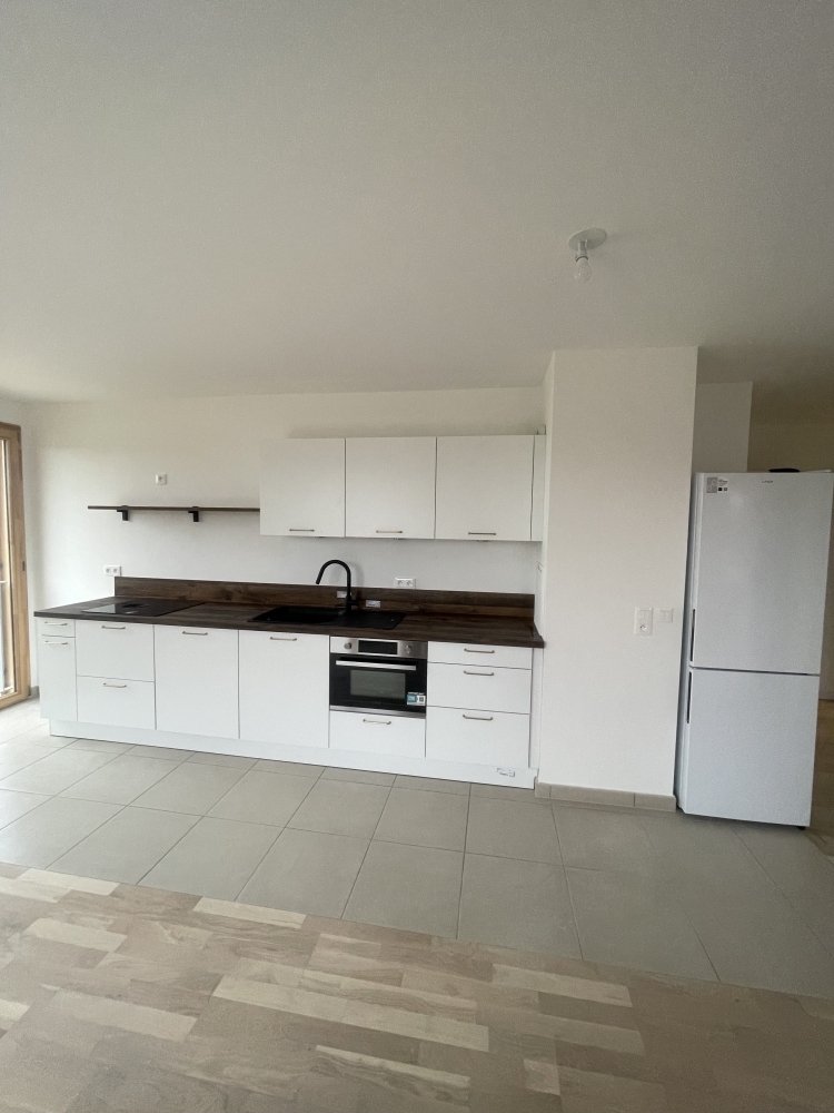 Votre poseur de cuisine à Claye-Souilly, est intervenu dans un appartement neuf afin d'y installer une cuisine blanche avec un plan de travail effet bois, puis une crédence de 15cm.